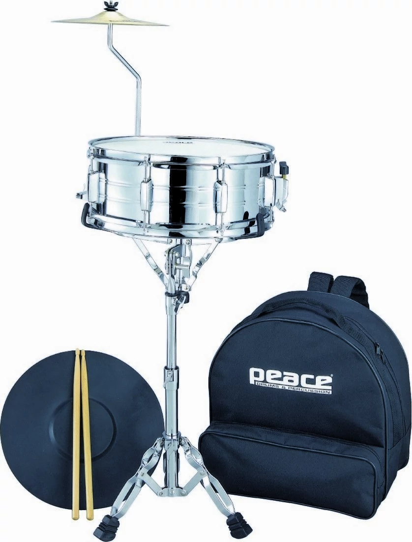 • At its core, the SD-18 includes a 5.5”x14” 8-lug Chrome snare, 14” sound-of f practice pad, drum key, and pair of drum sticks. The outfit comes with an Arena 600 Series telescoping snare stand that features an adjustable basket- type stand top that grips the drum, and the stand has extended telescopic range for concert applications as well as with traps. A 10” splash cymbal and mounting arm are also included in the package, opening up worlds of musical possibilities, and the snare kit fits in a durable, compact, nylon backpack bag , also included.