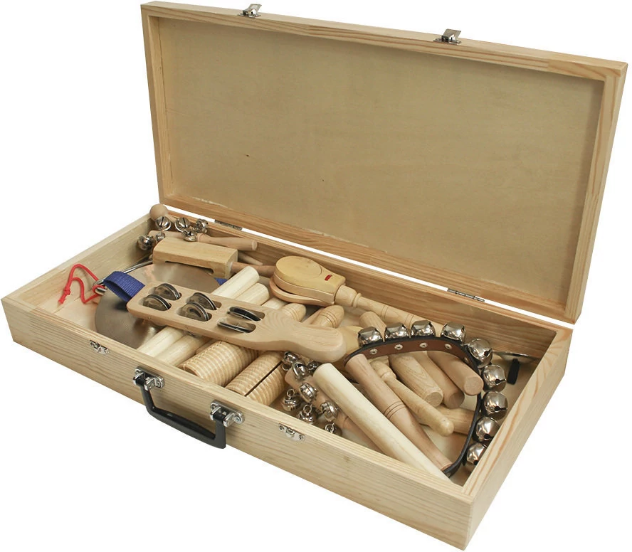ütőhangszer szett: gyermek ritmuskészlet, kasztanyetta, claves (tikfa), gyermek cíntányér, guiro, triangulum, csörgő, száncsengő, fa doboz