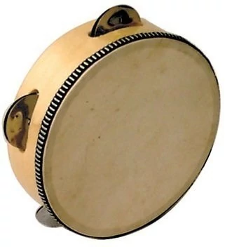 ütőhangszer: csörgődob, fa, 6˝ méretű, bőr, ütő, 4 pár csengő