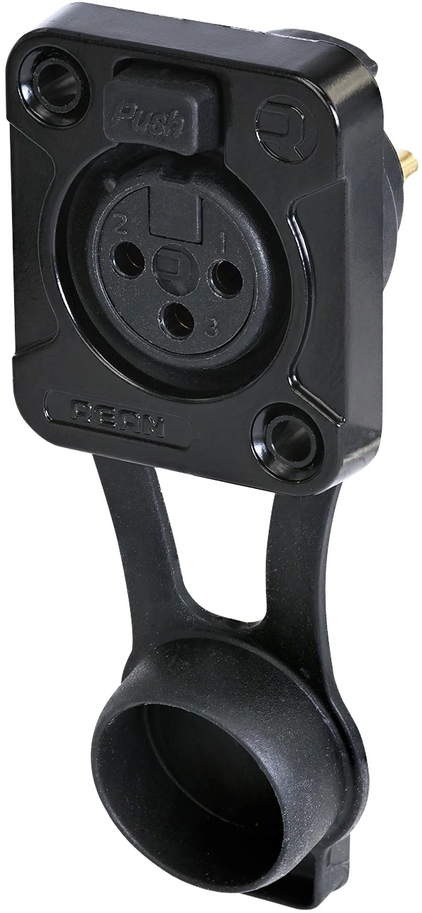 REAN XLR-Z sorozat. 3 pólusú XLR mama csatlakozóaljzat, IP65 védettség, fekete ház, aranyozott értintkezők