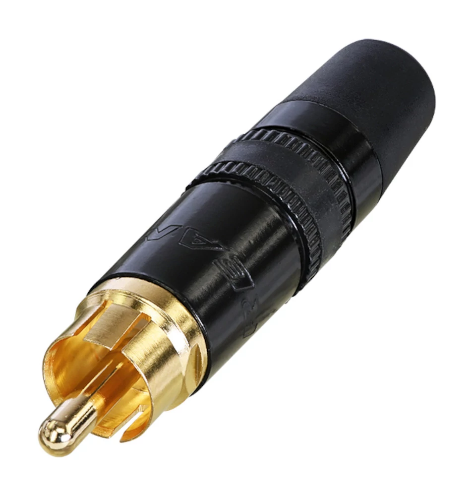 Phono dugasz, fekete burkolat, aranyozott érintkezők, gumi kábelcsizma a gubanc-mentességért, tokmány típusú tehermentesítő 3.5 és 6.1 mm közötti kábelátmérőhöz, színező gyűrű.