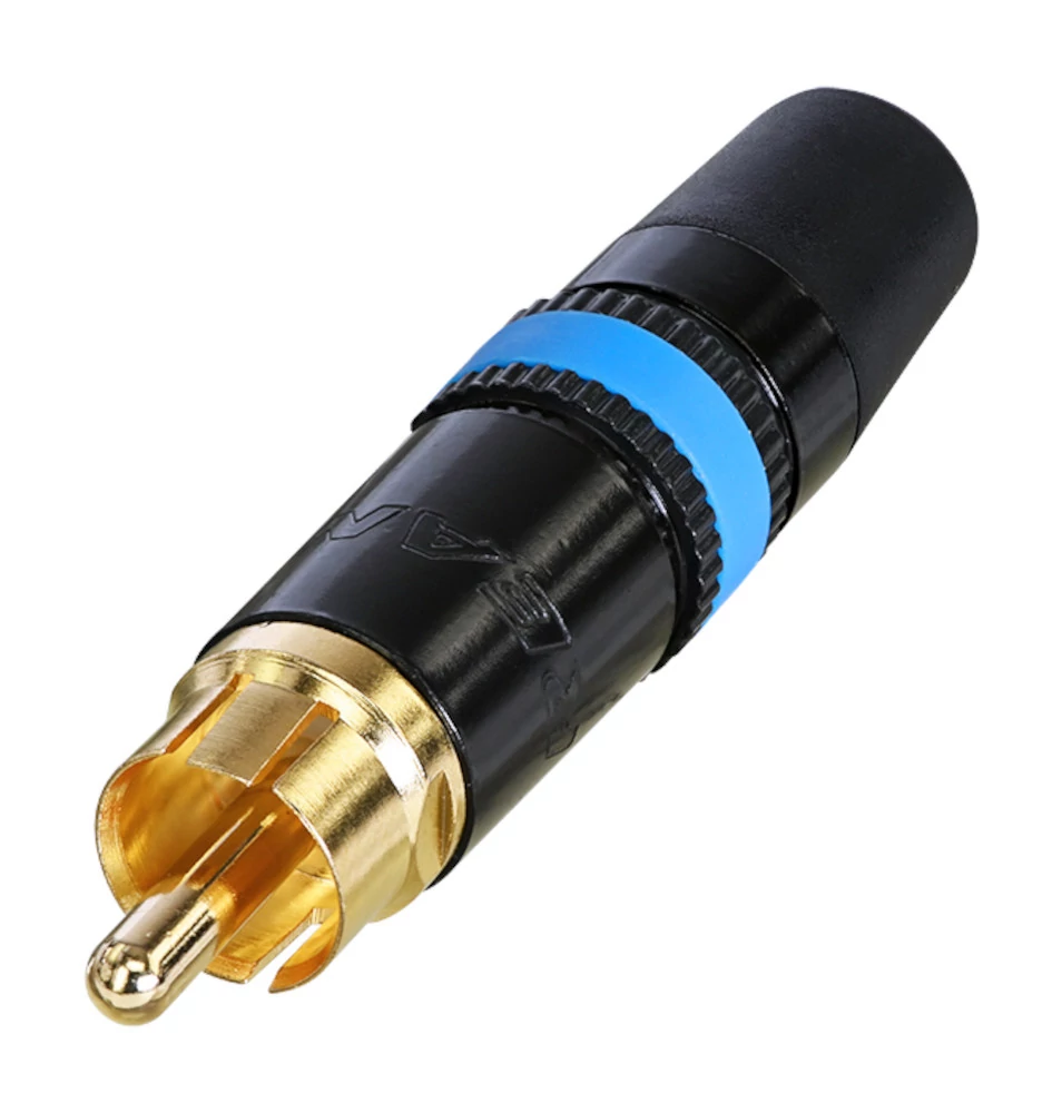 Phono dugasz, fekete burkolat, aranyozott érintkezők, gumi kábelcsizma a gubanc-mentességért, tokmány típusú tehermentesítő 3.5 és 6.1 mm közötti kábelátmérőhöz, színező gyűrű.