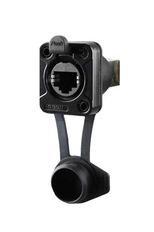 RJ45 átvezető csatlakozóaljzat, IP65 védettség, D-típusú fekete ház, aranyozott érintkezőkkel. Légmentes, védi készülékét a levegő behatolásától.