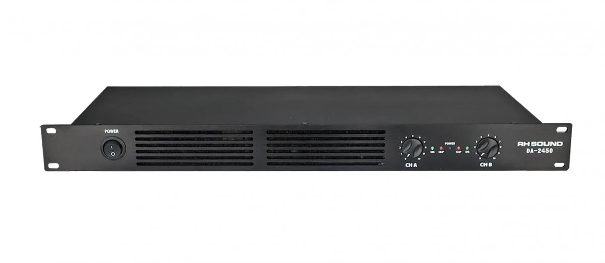 RH Sound DA2450 digitális teljesítményerősítő Teljesítmény: 2 x 450 W / 4 Ohm, 2 x 300 W / 8 Ohm, 1 x 900 W / 8 Ohm, Frekvencia tartomány: 20 Hz-20 KHz(+/-0.5 dB) Torzítás: max. 0,05 %, Bemeneti impedancia 10 kOhm nemszimmetrikus, 20 KOhm szimmetrikus Jel/zaj arány: > -100 dBA,