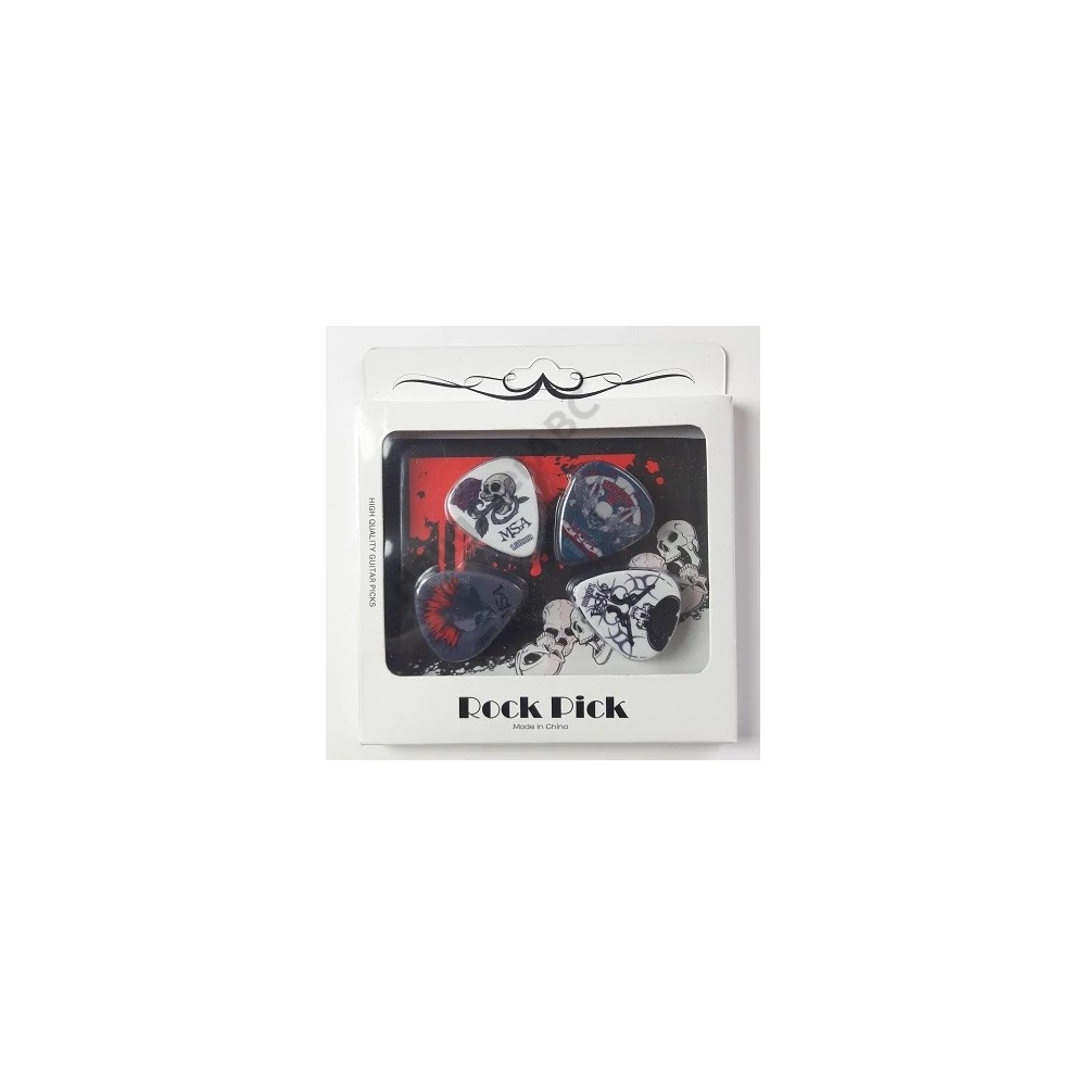 Rock Pick PIR 150, 12 db-os celluloid motívumos pengető. Igényes grafikákkal, díszdobozban, akár ajándéknak is! A grafika nem kopik le, a pengető anyaga is tartós, merevebb műanyag.