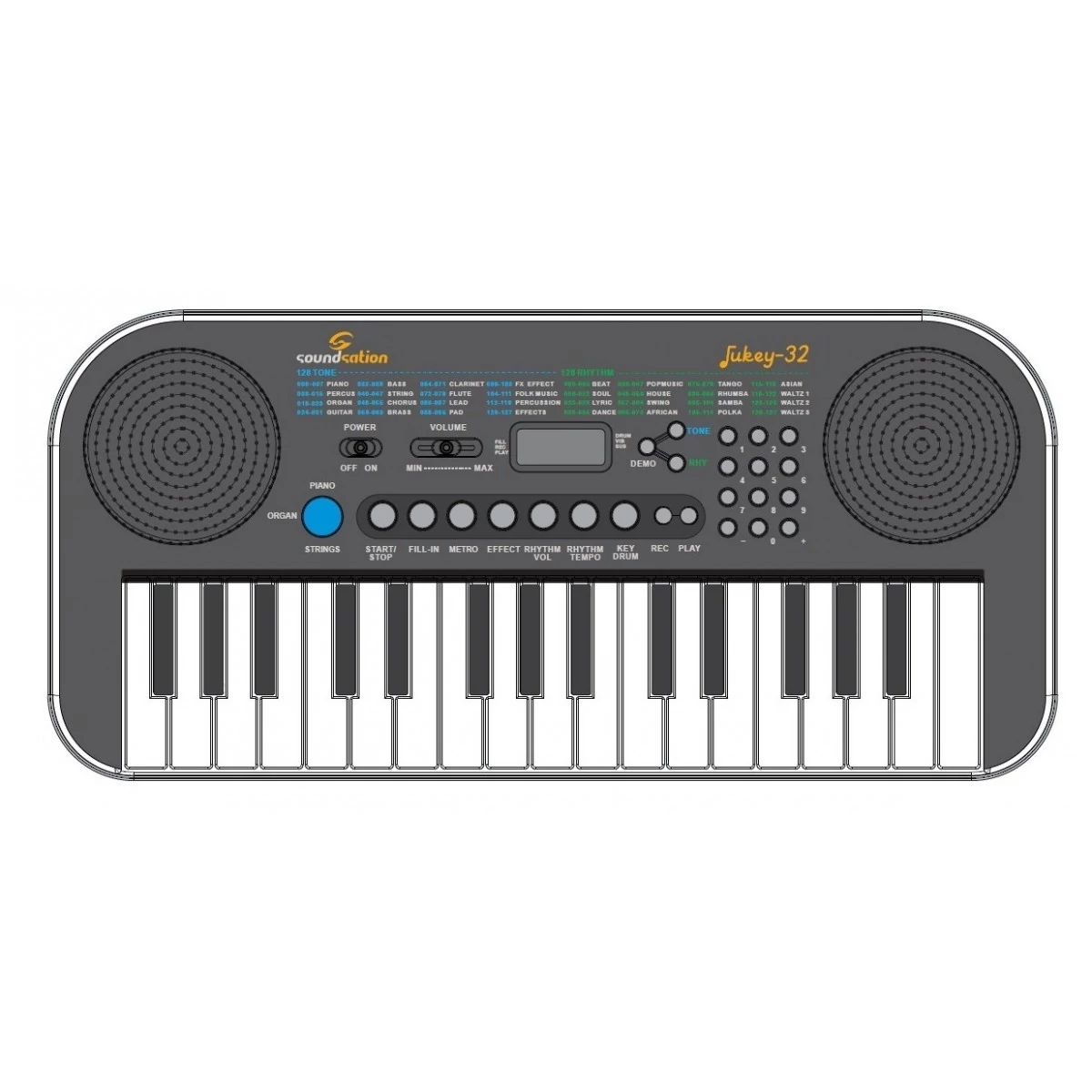 - A JUKEY-32 egy kompakt billentyűzet, 32 mini méretű billentyűvel, kifejezetten azoknak a gyermekeknek, akik azon túl, hogy szórakoznak ezzel a hangszerrel, kezdik megtenni az első lépéseket a zene tanulásában. Ez a billentyűzet olyan funkciókkal rendelkezik, mint például a felvétel és lejátszás, amelyek általában a komolyabb billentyűzeteken találhatók. A billentyűzet által kínált hangok, ritmusok és dalok széles skálájának köszönhetően szórakozhat a különböző zenei műfajokban. A kompaktság és az elemes működés lehetősége teszi ezt a billentyűzetet olyan eszközzé, amelyet még az iskolában is használni lehet.