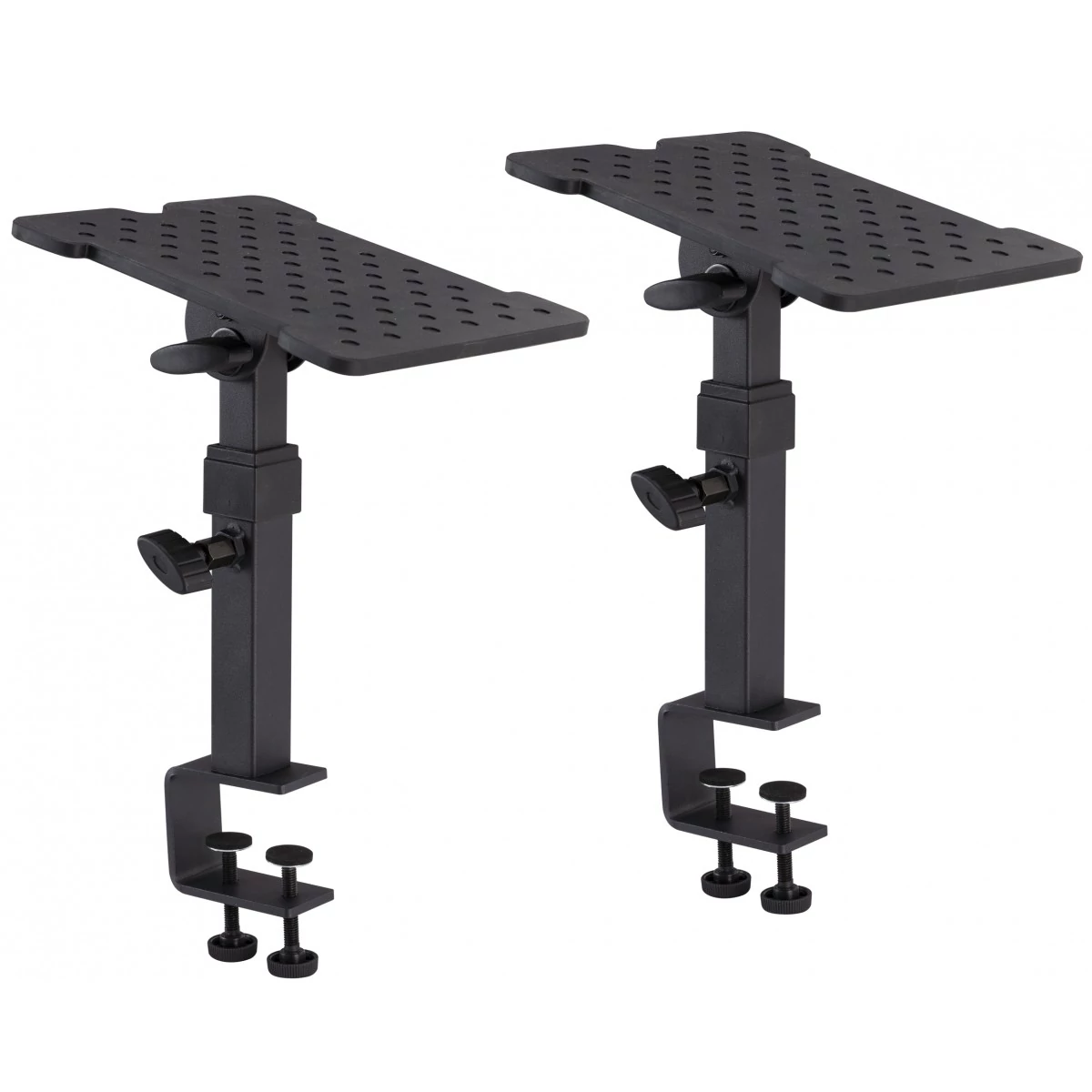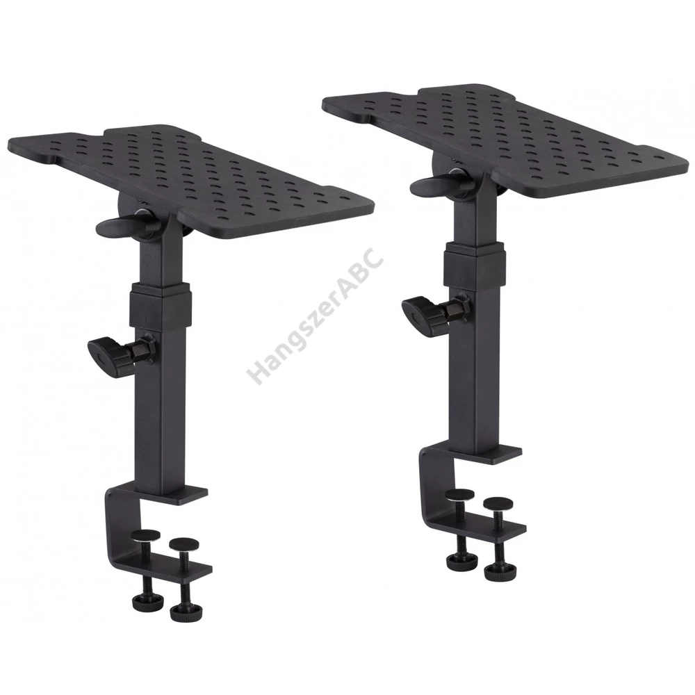 - A TMONS-PRO professzionális fém asztali állvány stúdió monitorhangfalakhoz rögzítőbilincsekkel. Robusztus és stabil, állítható magasság és dőlésszög. A gumi felső felület megakadályozza a hangszóró megcsúszását döntött beállítás esetén. A bilincs két rögzítési ponttal rendelkezik a maximális stabilitás érdekében, és akár 50 mm vastag asztalra is illeszkedik.