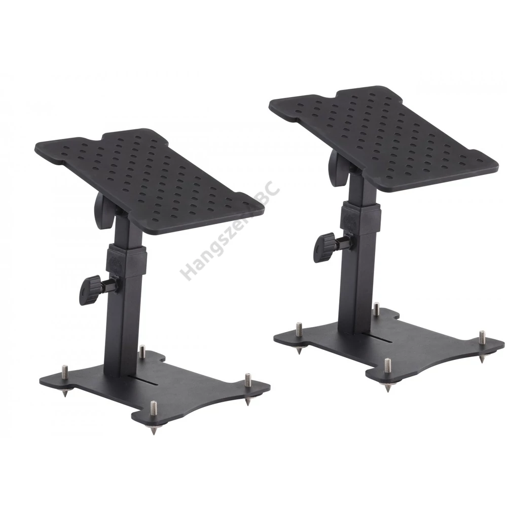 - A TMONS-PRO professzionális fém asztali állvány stúdió monitorhangfalakhoz. Robusztus és stabil, állítható magasság és dőlésszög. A gumi felső felület megakadályozza a hangszóró megcsúszását döntött beállítás esetén. A szigetelés alapvető tényező az állványon. Ebből a célból az alap alatt 4 gumi távtartó található és opcionális fém tüskéket is mellékelünk, amelyek csökkentik az asztal érintkezési felületét.