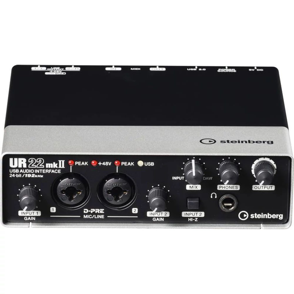 - Analóg bemenetek: 2x kombinált XLR/Jack (2 D-Pre előfok), Input 2 kapcsolhatóan Hi-Z (gitárhoz), fantom táp