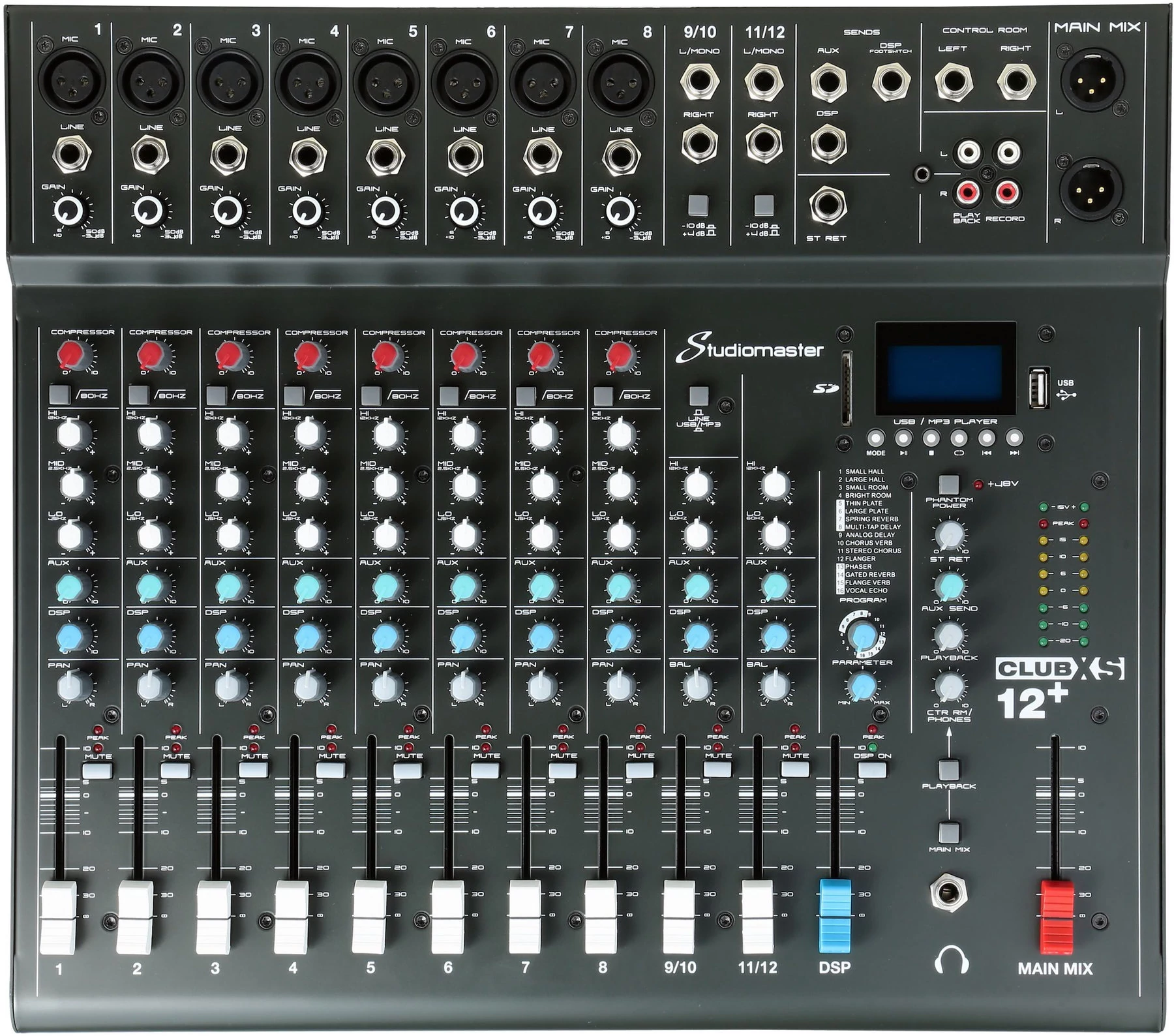 Mixer 12 bemenet, 8 mikrofon bemenet, 3-sávos EQ, 48V fantom + 16 DSP effekt, Bluetooth és USB