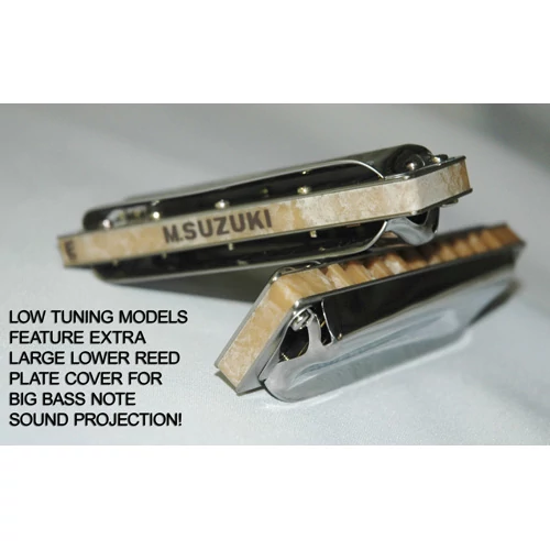 A Suzuki Manji Low, azaz mély hangolású modellek egy oktávval mélyebbre hangolt szájharmonikák, amelyek egyedi, mély hangtónusa ideális választás lehet zenei kíséretre és szólójátékra egyaránt. Felépítése megegyezik a standard hangolású Suzuki Manji-val: 10 hanglyukú, professzionális, diatonikus szájharmonika, teste speciális, modern fejlesztésű, aszimmetrikus, kompozit ötvözet, a klasszikus és telt hangzást érdekében.