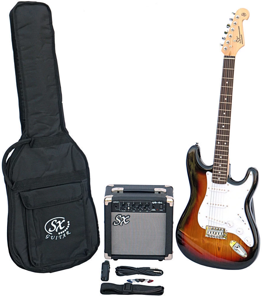 elektromos gitár szett: Stratocaster típus, kombó, kábel, heveder, pengetők, hangológép, hordtáska, 3 tónusú Sunburst