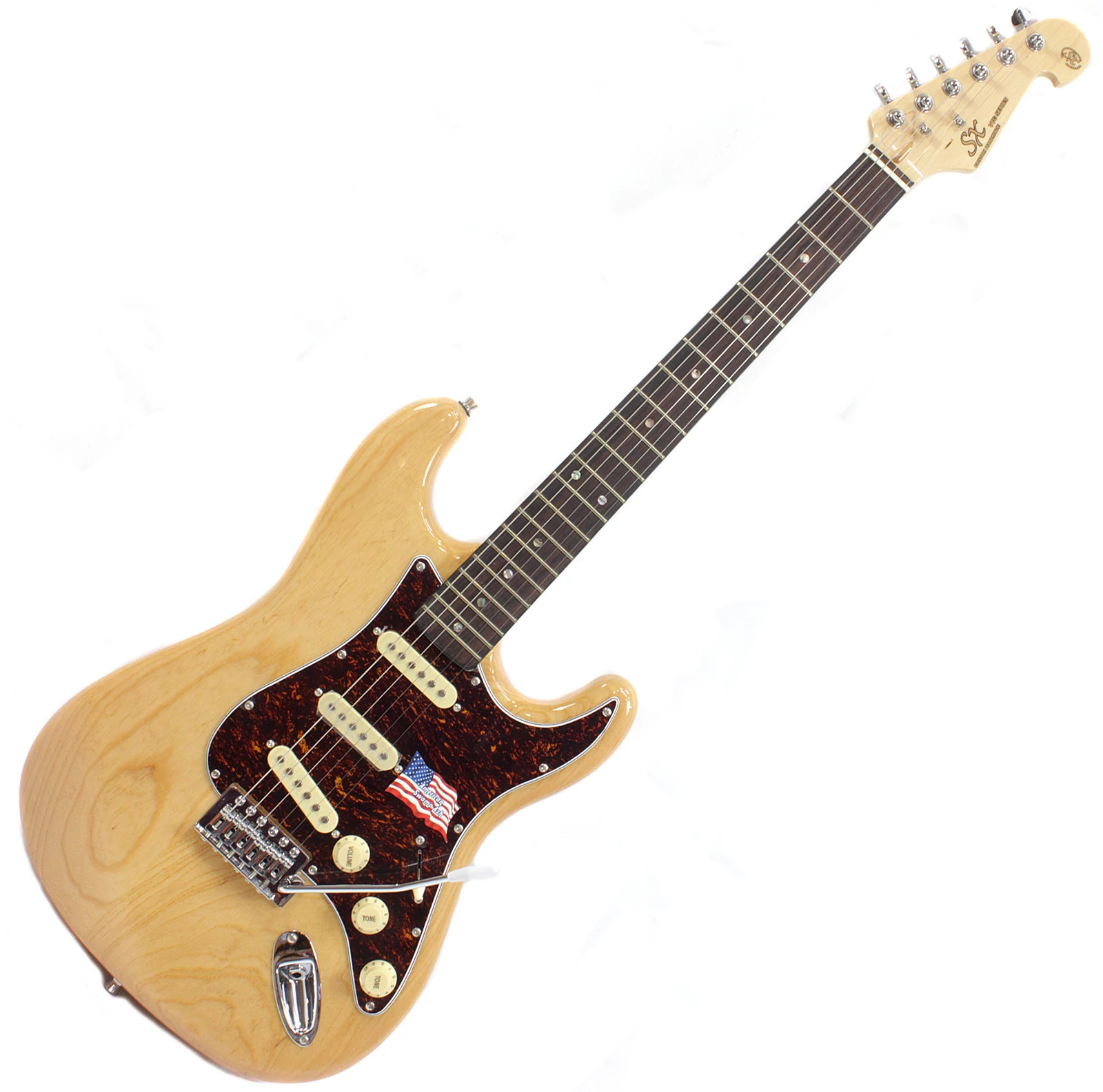 elektromos gitár: Stratocaster forma, Ash (kőris) széria, rózsafa fogólap, natúr szín