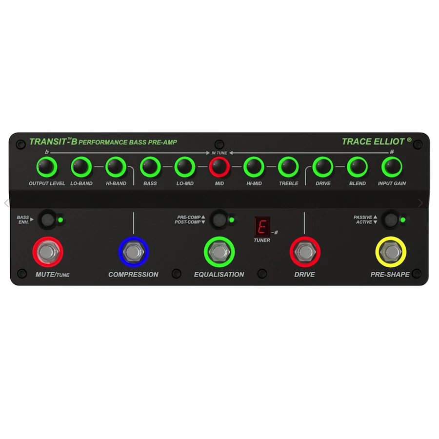 A Transit ™ B pedál egy professzionális minőségű előerősítő az igényes basszusgitárosok számára. A beépített szolgáltatások, mint a Pre-Shape, az 5 sávos EQ és a kettős kompresszor könnyen kezelhetővé teszik a pedált. Az olyan funkciók, mint a Drive és a keverésvezérlés, valamint a beépített mélyhang kiemelés, még tovább gazdagítják a rendelkezésre álló lehetőségeket. Hangoló bekapcsolásakor a háttérvilágítású vezérlőpanel kromatikus hangolóvá változik. A szimmetrikus Pre és Post XLR kimenetek, a „száraz” kimenet és a fejhallgató kimenete biztosítja a felhasználó számára legmegfelelőbb jelet.