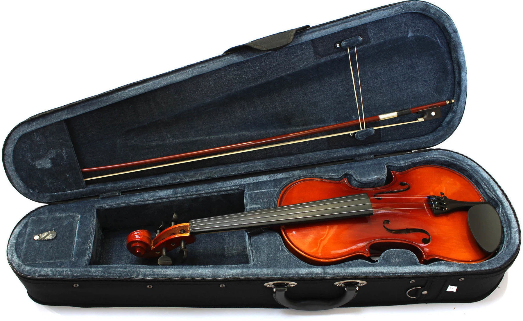 hegedű szett: 1/4 méretű hegedű, tömör lucfenyő fedlap, tőke és basszusgerenda, kétrészes "Fiddleback" tömör juharfa hátlap, bordázat, nyak, csiga és láb, ebonizált juharfa álltartó (nem műanyag), fém húrtartó négy finomhangolóval, ébenfa hegedűkulcsok, könnyű párnázott keménytok tárolórekesszel, tartozék gyanta és eredeti lószőrből készült vonó ébenfa kápával