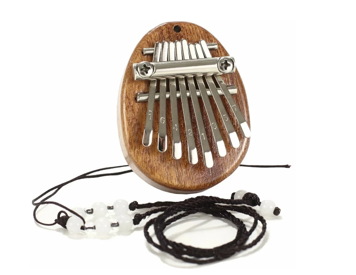 Fából készült mini kalimba, egy nagyszerű hangzású dallamos hangszer egyedi hangzással és dizájnnal. Egyáltalán nem kell értened a zeneelmélethez a kalimbához, még a véletlenszerű pengetés is gyönyörűen hangzik. A C-dúr hangsor mind a 8 hangja harmonikusan kiegészíti egymást, így soha nem fogsz rossz hangot játszani. Ez a modell nyolc vésett fém nád - kulcsot tartalmaz, amelyek együtt egy egész oktávot alkotnak. Tartozik hozzá egy madzag, így a nyakába, a táskájába akaszthatja, vagy dizájnos kulcstartót készíthet.