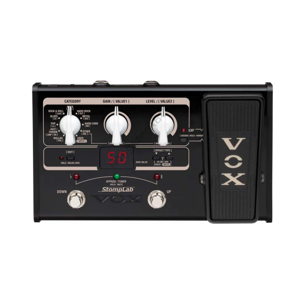 VOX Stomplab SL2G multieffekt processzor, expression pedállal és ajándék adapterrel 100 gyári beállítás, egyszerű kezelőfelület 60 db modellezett effekt a VT+ effekt processzor alapján 20 saját beállítás szerkeszthető és tárolható, egyidőben akár 8 effekt használható elemről vagy adapterről (nem tartozék) működtethető beépített kromatikus hangológép 9 féle pedál effekt 44 féle erősítő model 8 féle drive pedál szimuláció 12 féle láda szimuláció 9 féle modulációs effektek 8 féle visszhang effekt 3 féle zengető effekt zajzár