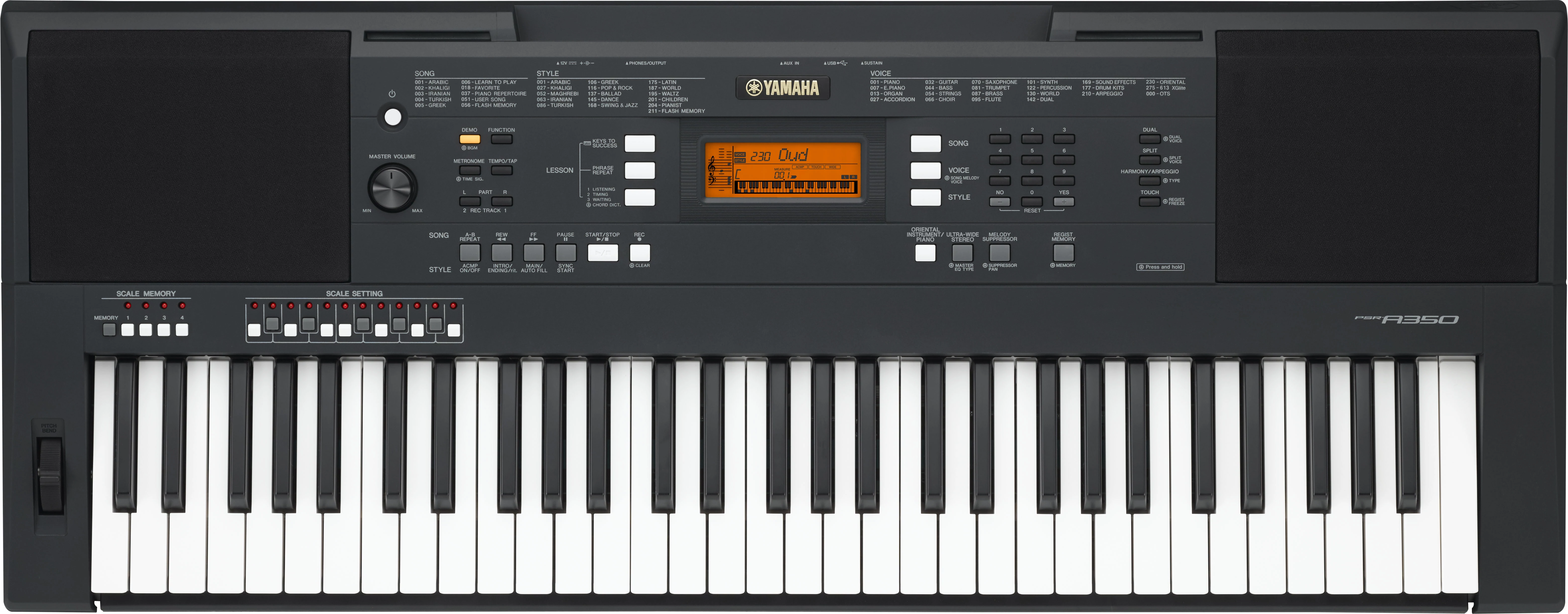A PSR-A300 modellt felváltó PSR-A350 egy nagyszerű keyboard, melyben a szabványos mellett megtalálhatóak a keleti hangszínek és stílusok is. Rendelkezik beépített oktató rendszerrel és kreatív tulajdonságokkal, mint például a hajlítókerékkel, a dallam kioltóval és az arpeggiatorral. A PSR-A350 egy izgalmas, sokrétű keyboard mely izgalmas utazást ígér a zene világának felfedezésében.